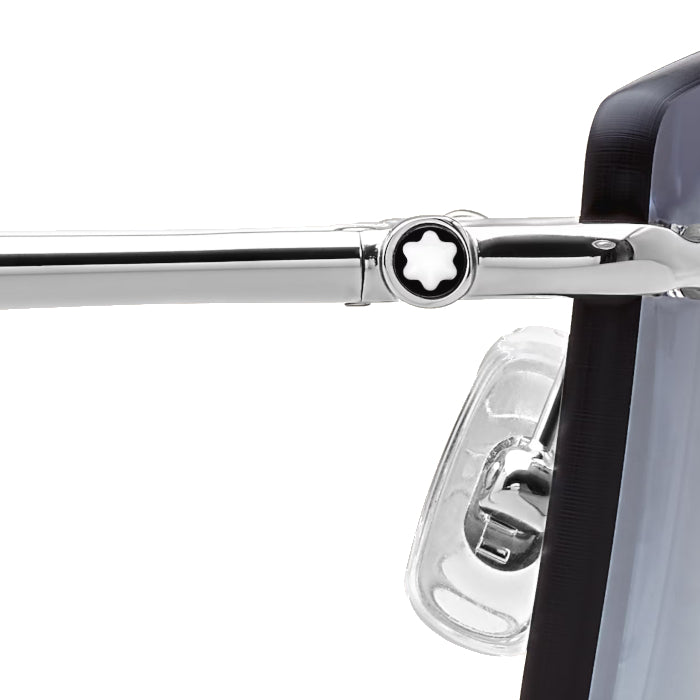 Ces lunettes de soleil carrées possèdent une monture métallique argentée et des verres bleus. Inspirées des instruments d'écriture Meisterstück, les branches tubulaires sont enrichies de 3 anneaux fins. Le logo Montblanc est gravé au laser sur le verre gauche et un détail en émail noir est dissimulé sur les extrémités.