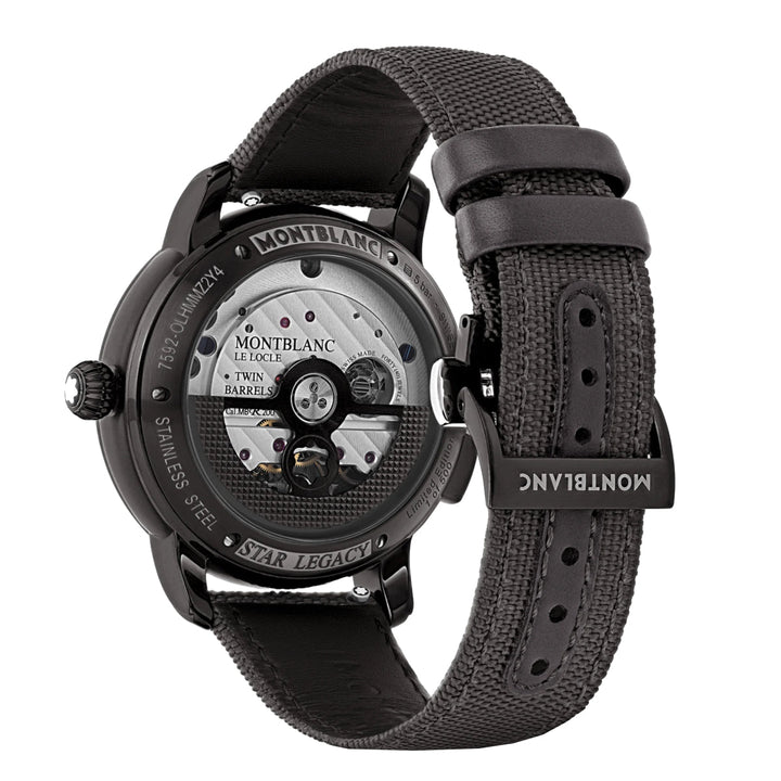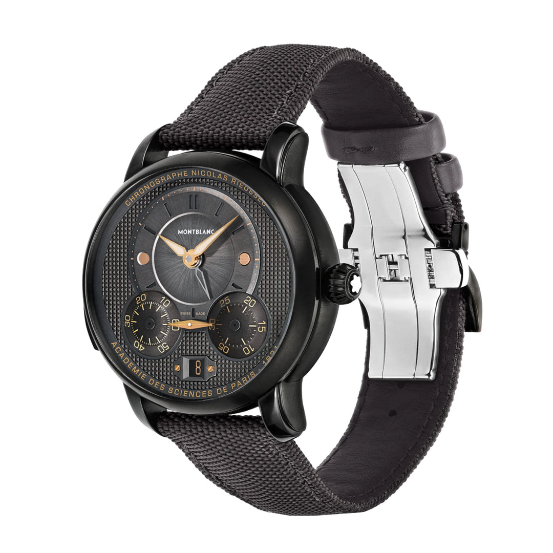 From the racing track of the Paris Champ of Mars on the wrist, Montblanc continues to reinvent its Star Legacy Nicolas Rieussec Monopusher Chronograph model through a new 43 mm edition. The Montblanc Star Legacy Nicolas Rieussec Chronograph watch limited to 500 copies presents a stainless steel case coated with black DLC, an anthracite dial and needles and pink gold indexes. This model presents several details which reinforce the historical link with Paris, where history has started, in particular a motif "Paris nails" on the dial which extends on the oscillating mass and the textile bracelet. This pattern is inspired by the geometric design of the paved streets of Paris and constitutes the ideal link between the past and the future. The watch is animated by the MB R200 manufacture movement.