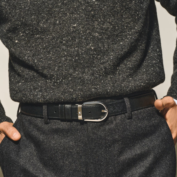 Cette ceinture réversible allie élégance discrète et praticité, offrant deux styles distincts en un seul accessoire. Dotée de notre boucle fer à cheval Montblanc distinctive au fini palladié, l'un des côtés de la ceinture de 30 mm est en cuir imprimé Saffiano de couleur noire, tandis que l'autre côté est en cuir Meisterstück noir élégant pour une sophistication classique.