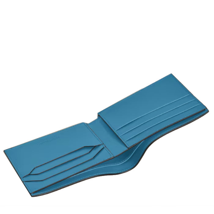 Le portefeuille Meisterstück est un accessoire luxueux du quotidien fabriqué en cuir brillant couleur bleu cendré et rehaussé d'un effet Sfumato appliqué à la main. Élégant et fonctionnel, il peut accueillir jusqu'à six cartes de crédit grâce à des fentes dédiées. Deux compartiments dédiés aux billets de banque et aux reçus ainsi que deux poches additionnelles offrent un espace de rangement supplémentaire.